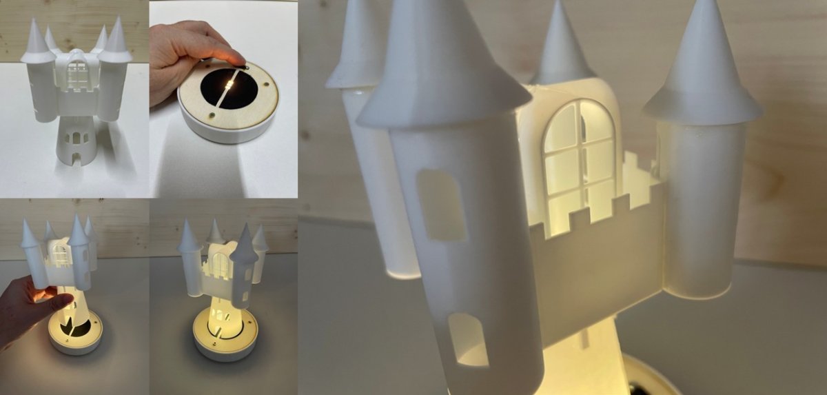 Kit imprimé en 3D, piles, ampoule LED et interrupteur. Diverses animations de cet atelier ont eu lieu à Fribourg.