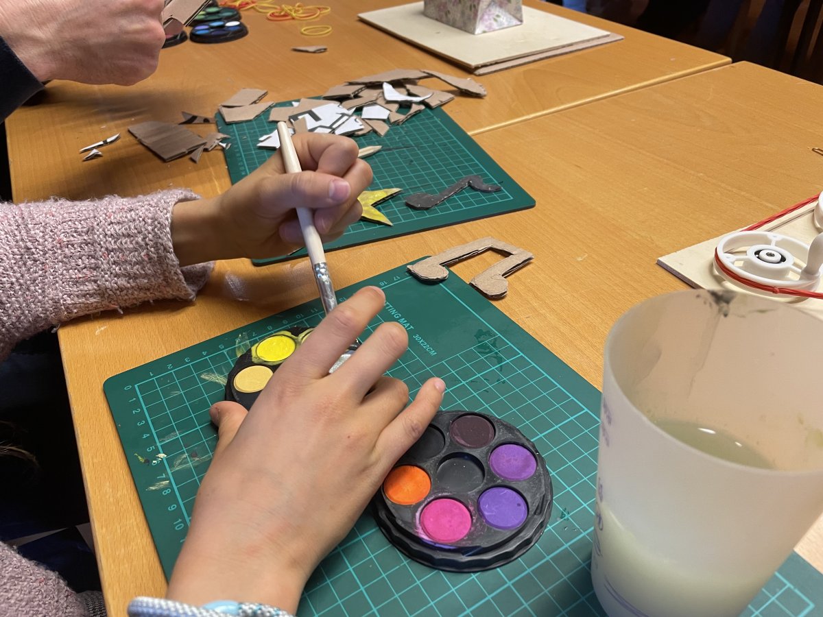 Kit en carton, moteur, fils à pinces crocodiles, piles et colle à chaud. Diverses animations de cet atelier ont eu lieu à Fribourg ( MEMO ), Bussigny et Lausanne.
